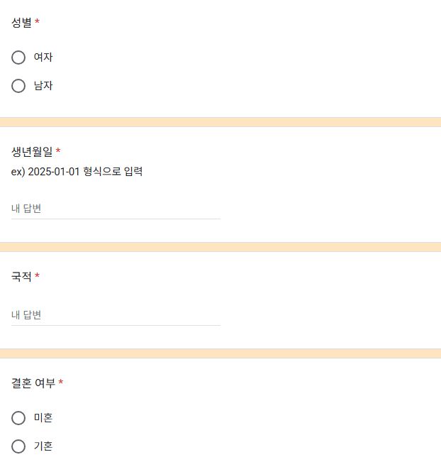 - 본인 정보: 이름, 성별, 생년월일, 연락처, 거주지역