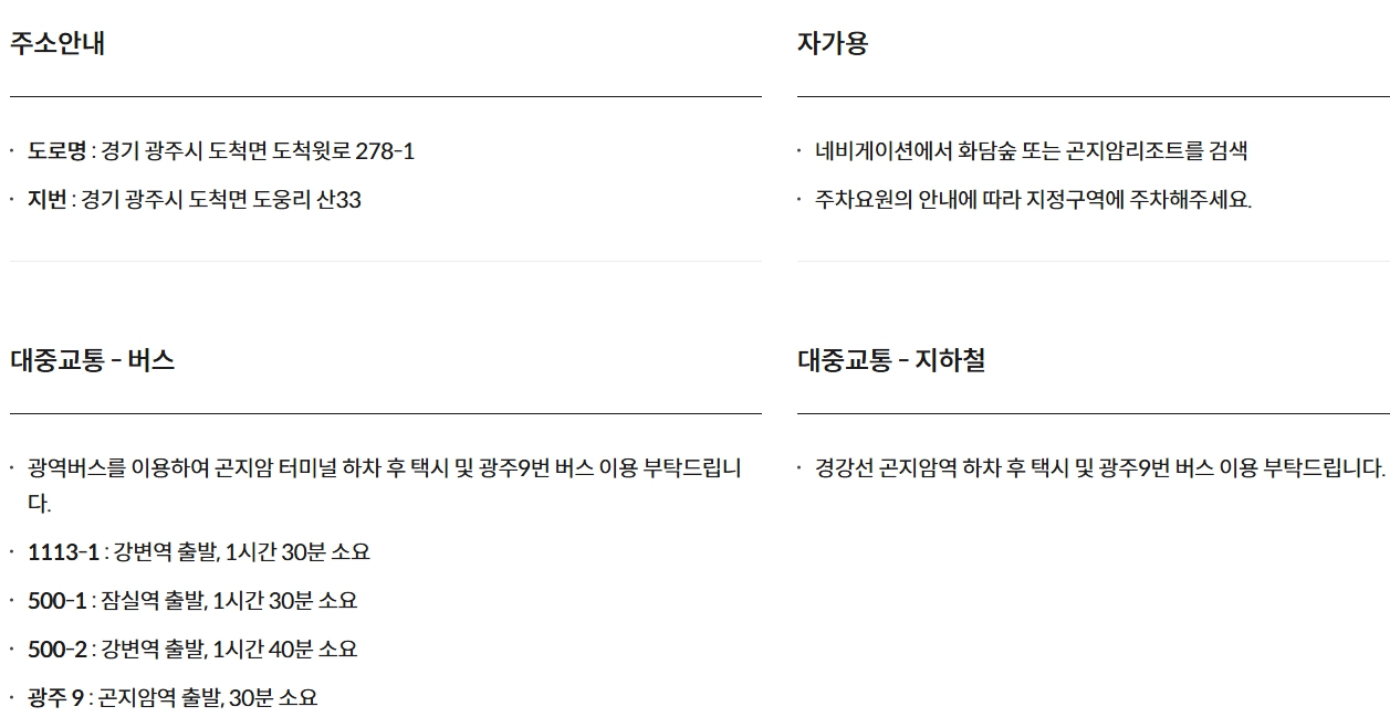 - **화담숲 수목원 연계**: 화담채는 화담숲 중심부에 위치해 있어요. 관람 후에는 연못 주변이나 분재원 쪽으로 이어지는 길을 따라 걸으면 동선이 자연스러워요.